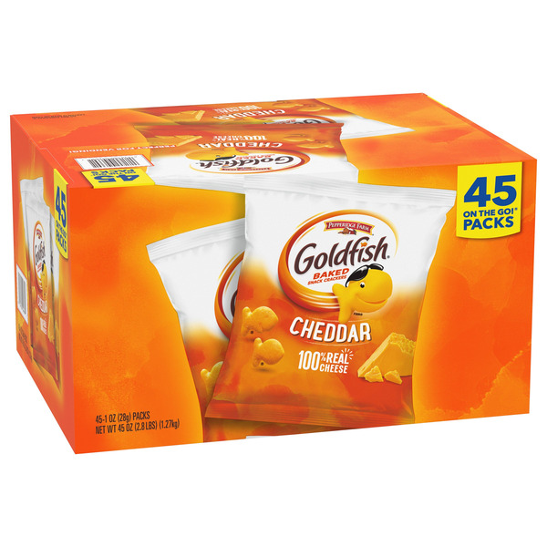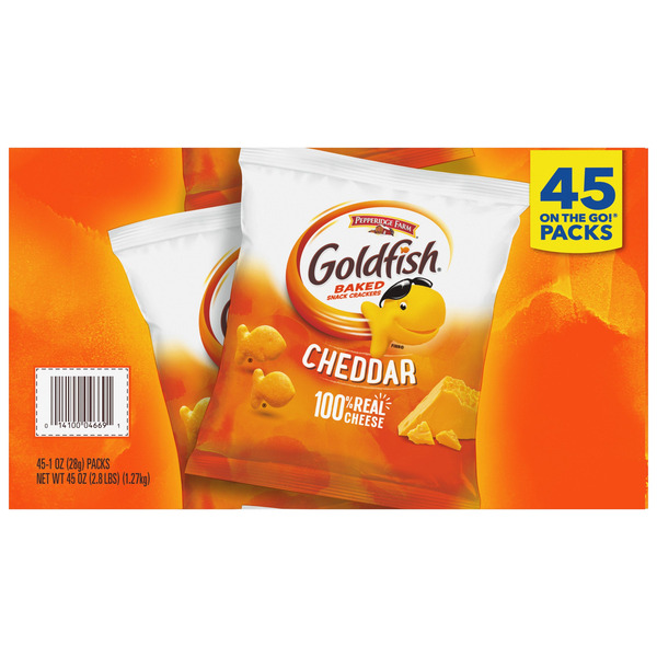 Baked Snack Goldfish Crackers; Cheddar; 45-count; 1 oz. bag; 100 % real cheddar.