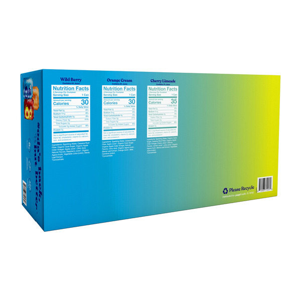 Flavors: 6 Wild Berry, 6 Orange Cream, & 6 Cherry Limeade. Prebiotic Soda; 5g of Sugar; Total Net Volume: 216 fl. oz.